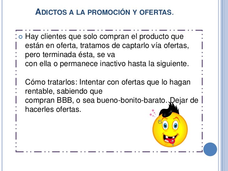 Cómo tratarlos: Precios disuasorios (extravagantes); servicio predefinido,haciéndoles pagar suplementos de servicio a partir del cual generan pérdidas.- Adictos a la promoción y ofertas.