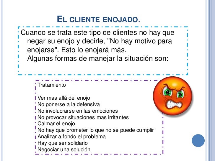 Cuando se trata este tipo de clientes no hay que negar su enojo y decirle, "No hay motivo para enojarse". Esto lo enojará más. Algunas formas de manejar la situación son: