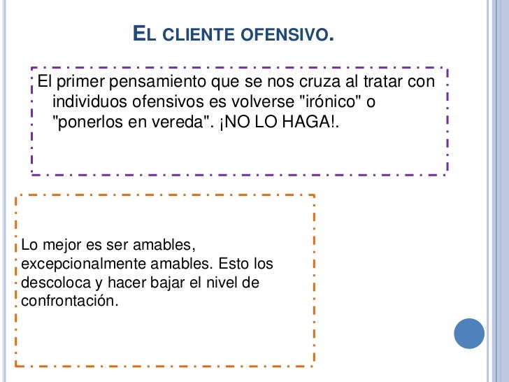 Lo mejor es ser amables, excepcional mente amables. Esto los descoloca y hacer bajar el nivel de confrontación. - El cliente infeliz.